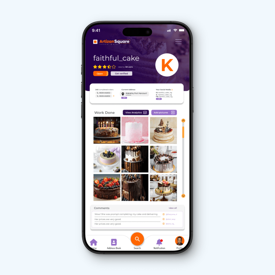• Artisan Profiles: Detailed portfolios showcasing skills, past projects, pricing, and reviews.