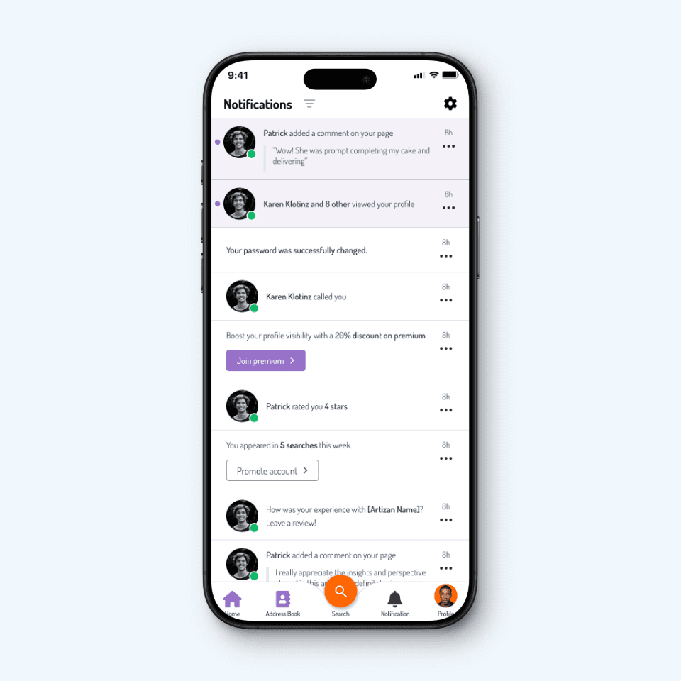 • Notification Center: Real-time alerts for messages, booking updates, and promotions.