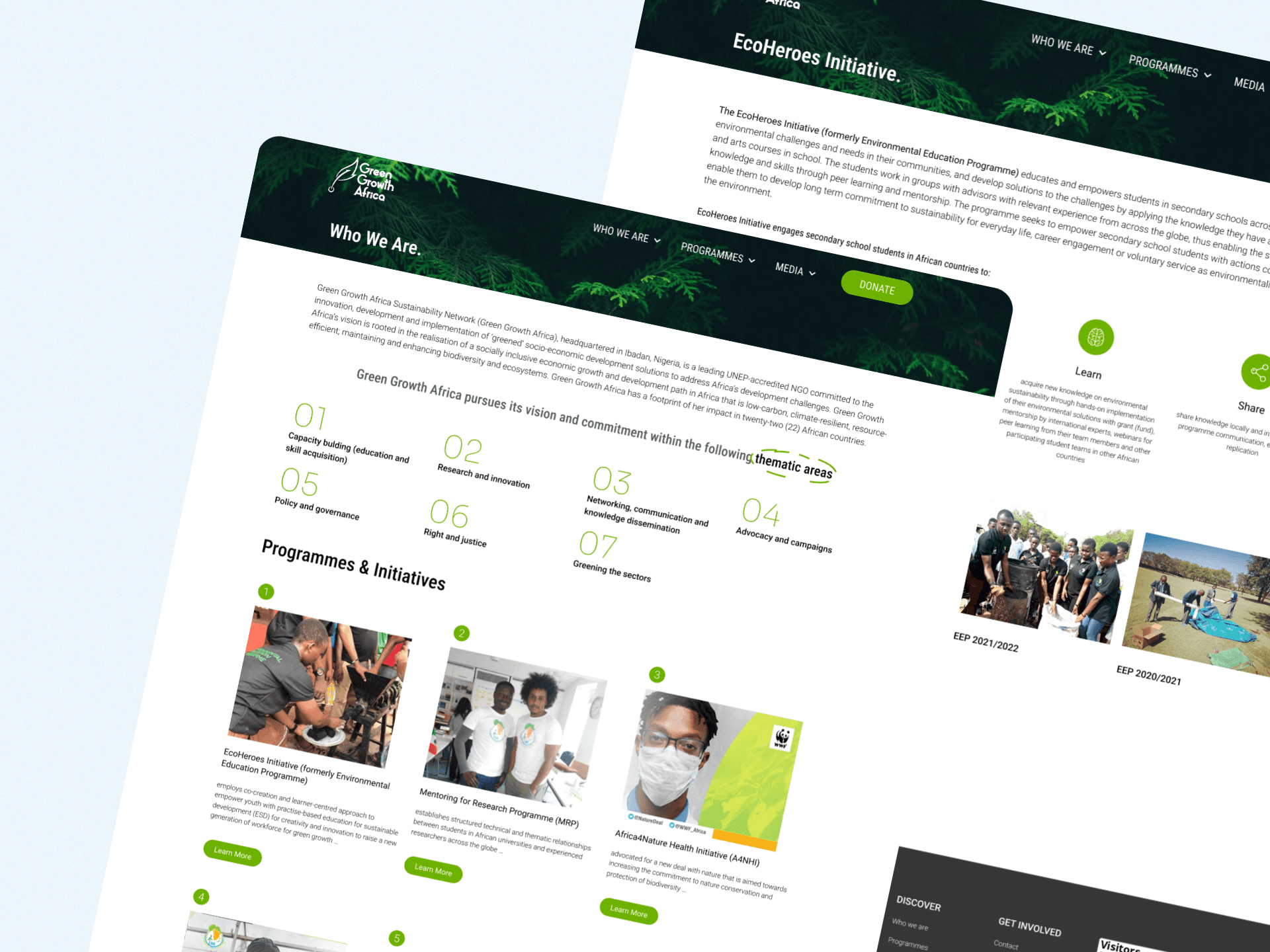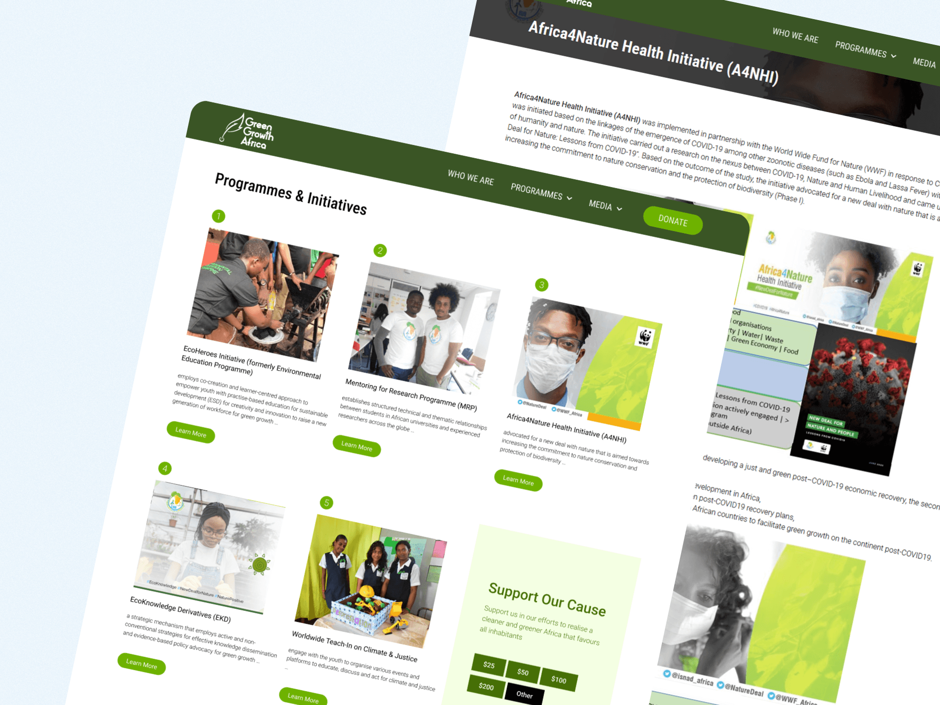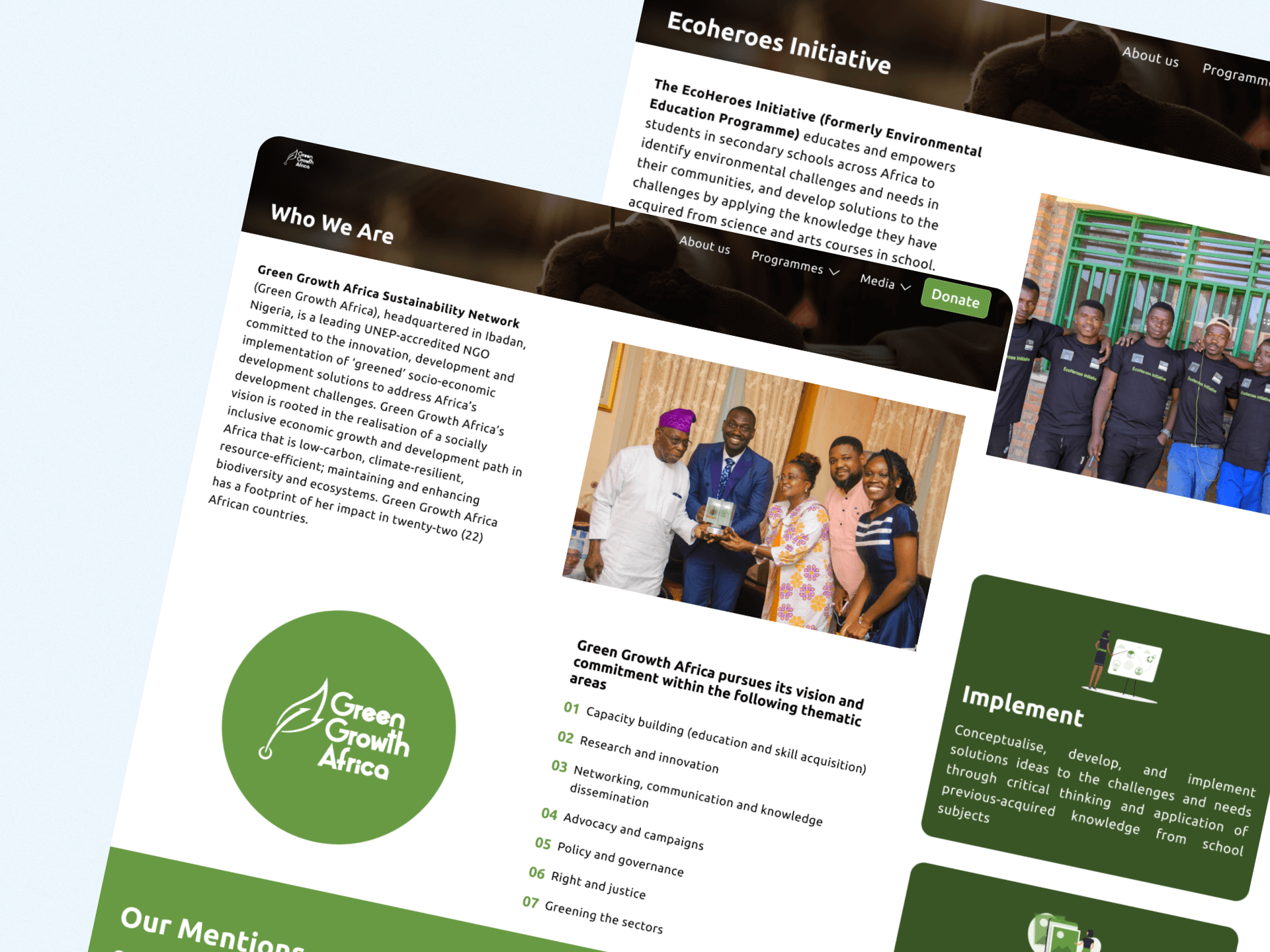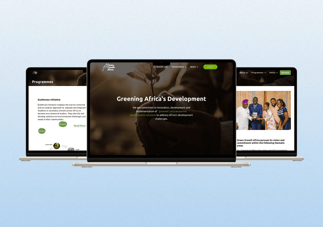 Green Growth Africa is a sustainability-focused organization dedicated to empowering African youth, fostering environmental education, and driving green growth initiatives across the continent. This project involved redesigning and rebuilding their outdated website to better reflect their mission, showcase impactful programmes like the EcoHeroes Initiative and Mentoring for Research Programme, and improve user engagement. The redesign prioritized clarity, accessibility, and seamless navigation to highlight their environmental projects, partnerships, and educational resources.
